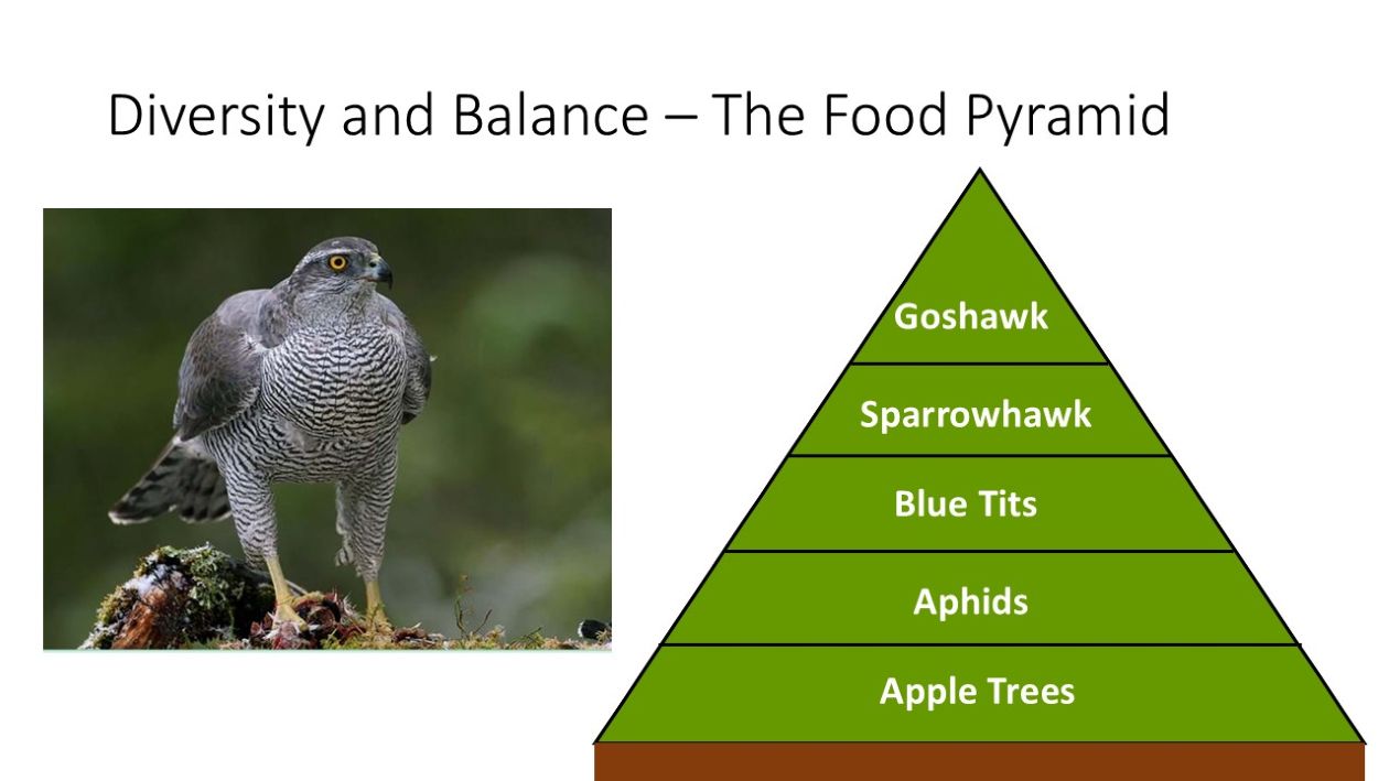 The second part of the talk was delivered by Roy. He spoke on the principles of rewilding. The aim, he said is to restore and protect the natural environment with limited human intervention in other words ‘Let nature do its part’. Roy explained how diversity and balance is important . He used an ecological pyramid diagram to illustrate this. At the bottom is soil which is vital in supporting plant and animal life. The next layer contains plants, for instance our native crab apple tree. Above this are aphids which are abundant on apple trees and above this are blue tits or the ‘pest removal service’. They consume a large amount of aphids. Above the blue tits are sparrowhawks. They predate on small birds regulating their numbers so that mortality from starvation and disease is decreased. The apex predator is the goshawk. This large bird of prey feeds on mammals such as rabbits and medium to large size birds like the sparrowhawk, magpie, crows and jays. Weighing five times as much as the sparrowhawk it was once common but is now scarce in Ireland. To introduce more of these birds, requires space and agreement from people living in the area. Unfortunately, not all outcomes are known but without trying there is an imbalance in the countryside. A predator even further up the pyramid which preys on goshawks are eagle owls. They are sparsely distributed in Europe and Asia and inhabit a wide range of habitats. They are often found in the largest numbers in areas where cliffs and ravines are surrounded by trees and bushes. Five were released to rebalance ecosystems in the Danube delta in 2024. They were once found in Ireland but disappeared around 200 years ago, although there have been sightings in Belfast and other parts of County Antrim, all probably escapees. The problem of reintroducing them is they require space, are very territorial and have the potential of becoming dangerous especially if there is not sufficient prey.
