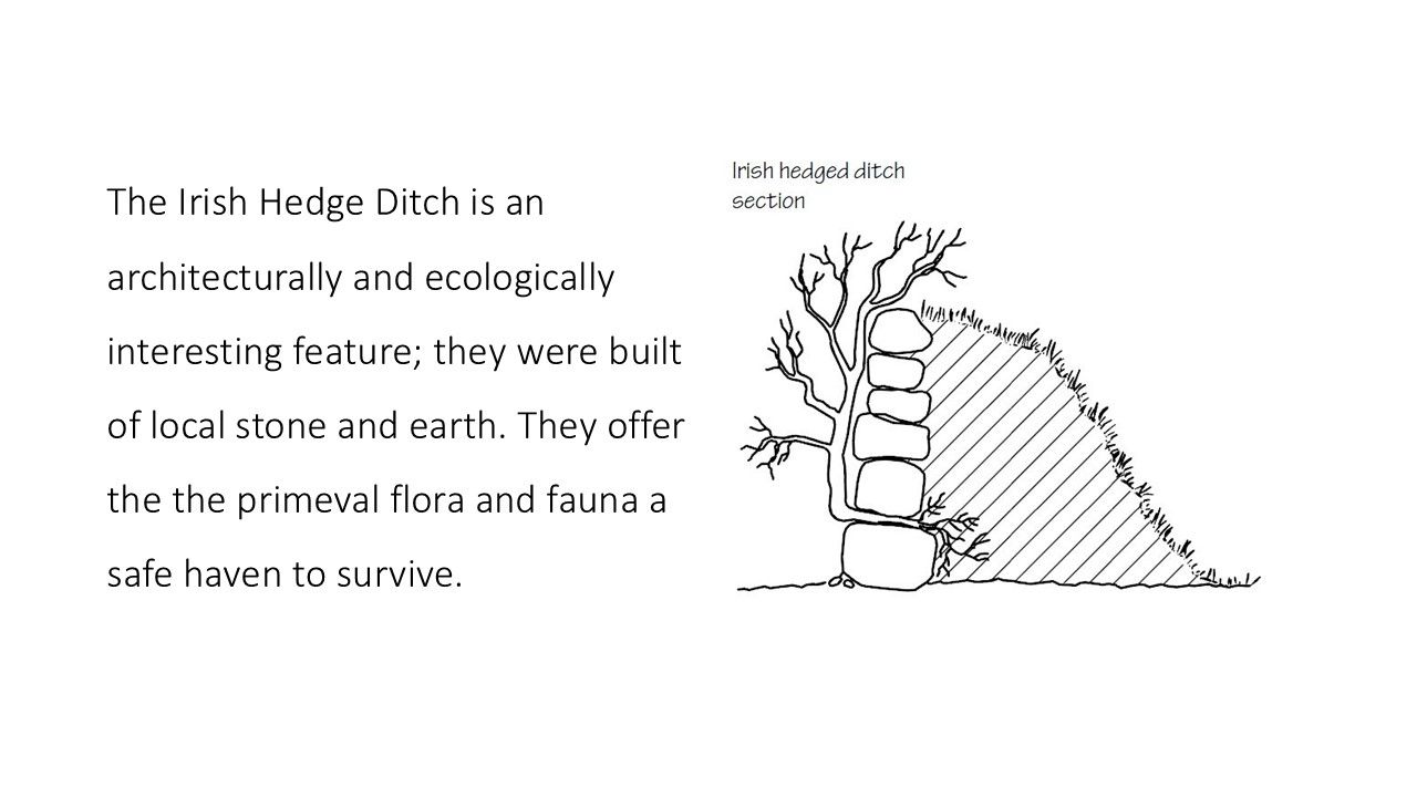 Kathyrn began her address by explaining the importance of habitat corridors in other words hedges which not only act as nature corridors but also as a refuge for woodland species. Some of the oldest hedgerows can be traced back to medieval times and even earlier. She explained the different types of hedges including the Irish ditch hedge. This is the term for the combination of a hedgerow and an accompanying trench It is formed by digging a ditch and piling the soil to create a bank which is then planted with shrubs or trees to form a dense hedgerow . Ancient hedges are home to so many different species such as wood anemones, wood sorrel, bluebell, violet and stitchwort as well as animals like hedgehogs, amphibians and many birds .Unfortunately hedges are being lost to modern agricultural practices.